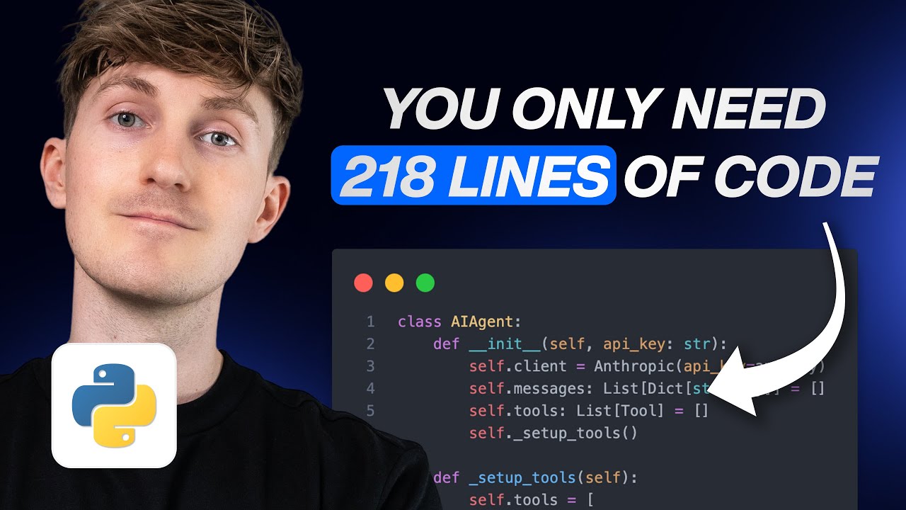 In this tutorial, you learn how to build an AI coding agent from scratch using just over 200 lines of Python code. The agent can interact with files in a directory by listing files, reading file contents, and editing files based on user instructions. The entire agent is contained within a single main.py file, making it a compact yet powerful example for beginners interested in understanding how AI agents work behind the scenes. The tutorial encourages cloning the GitHub repository and setting up the environment using the fast Python package manager UV, which simplifies dependency management and execution.