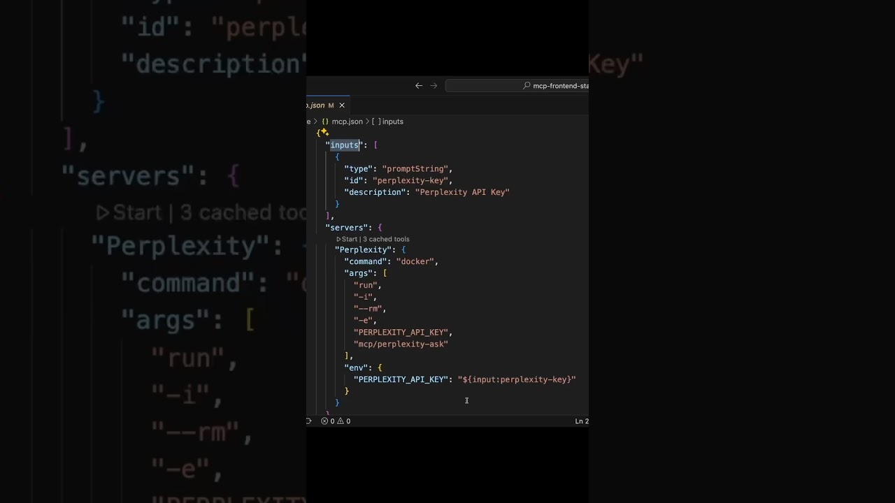 Configuration of the MCP server is managed through a JSON file named MCP.j, located in the VS Code folder. Users can add new servers by clicking the add server button within this JSON file, selecting the server type, and filling out the template that appears. For existing servers like Perplexity, the configuration includes general properties such as command and arguments, as well as input variables for sensitive data like API keys. These input variables allow users to securely input and store sensitive information without hardcoding it into the configuration.