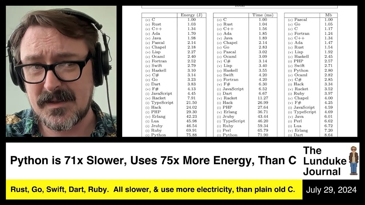 The video discusses a study from 2021 that compares the performance and energy efficiency of various programming languages, highlighting that Python is significantly slower and consumes more energy than C. The study found that Python is 71 times slower and uses 76 times more energy than C when performing the same tasks. This finding is particularly striking given Python’s widespread use in many applications, especially in Linux environments, where many scripts and tools are written in Python.