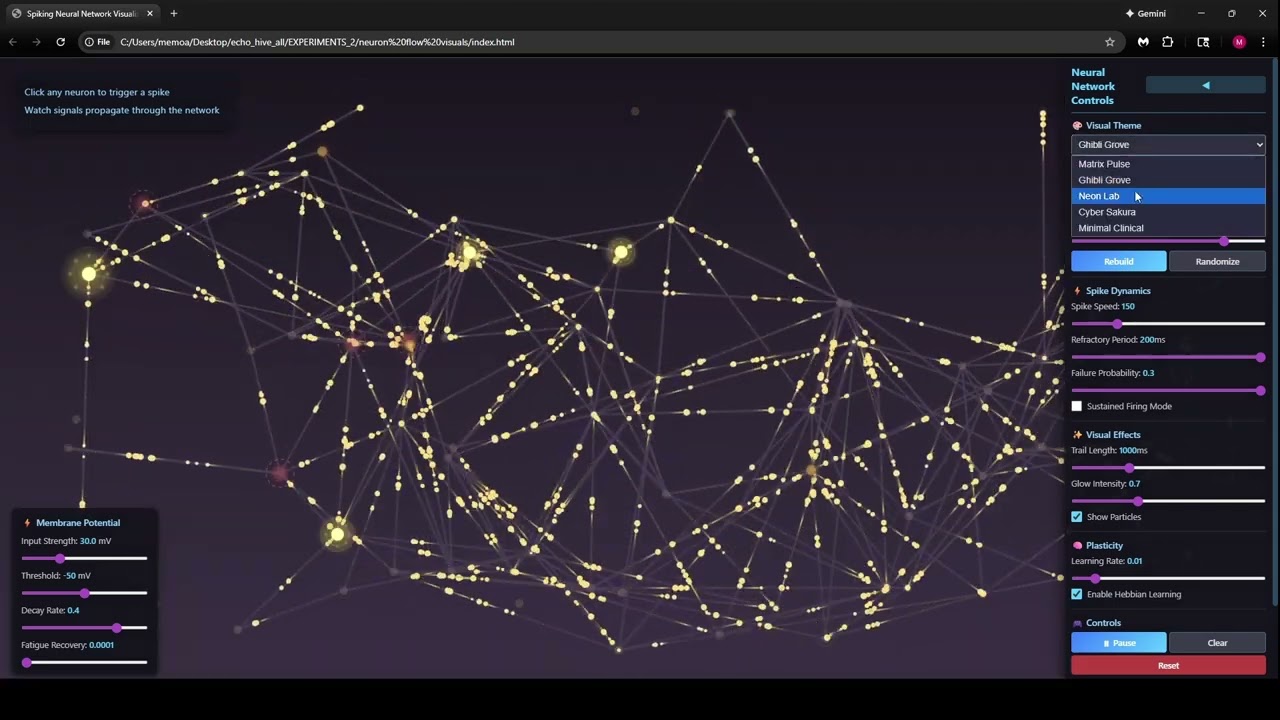 The video titled “Spiking Neural Net Activation Waves with Bio-Inspired Parameters” presents a visually engaging exploration of spiking neural networks (SNNs) and their dynamic activation patterns. Throughout the video, rhythmic and atmospheric music accompanies the visualizations, creating an immersive experience that highlights the intricate wave-like activations within the network. The visuals depict how spikes propagate through the network, resembling waves of heat or energy moving across a biological neural substrate.