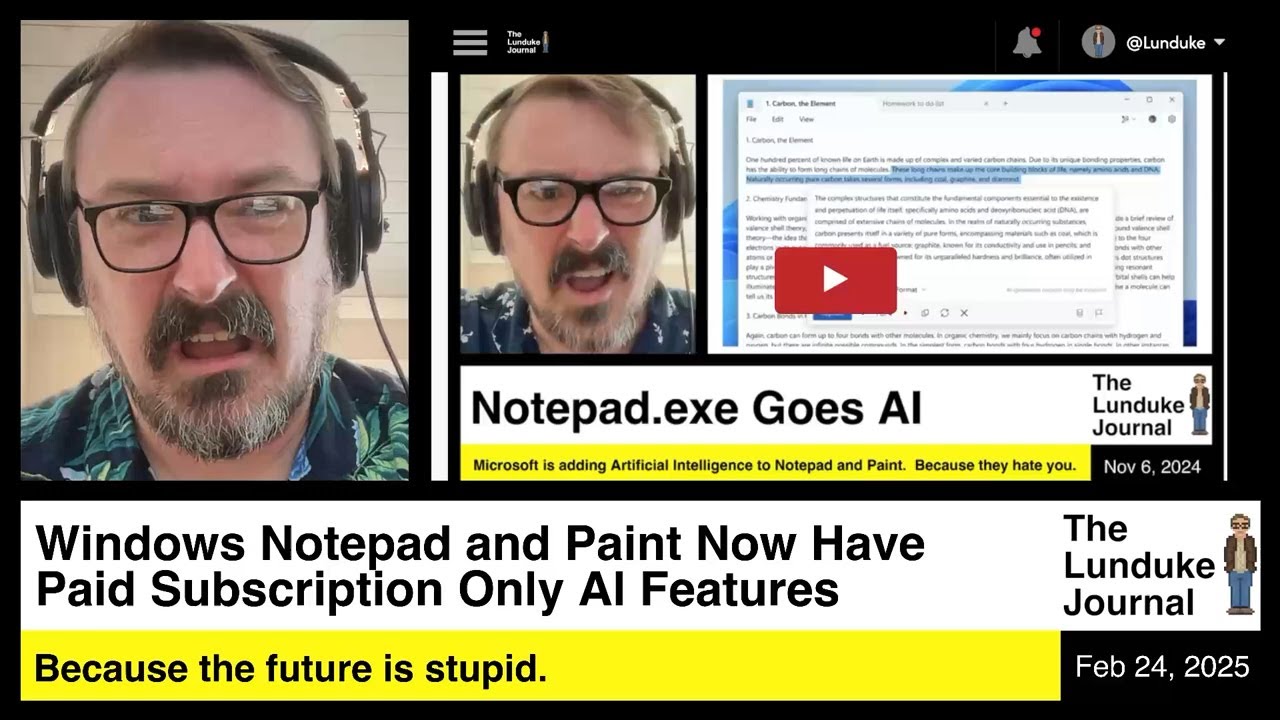 Microsoft has introduced paid subscription-only AI features for Notepad and Paint, requiring users to have a Microsoft 365 subscription to access advanced functionalities, which has sparked frustration among users. The video critiques this trend of monetizing basic applications, highlighting concerns about the future of software accessibility as more tech companies adopt similar subscription models.